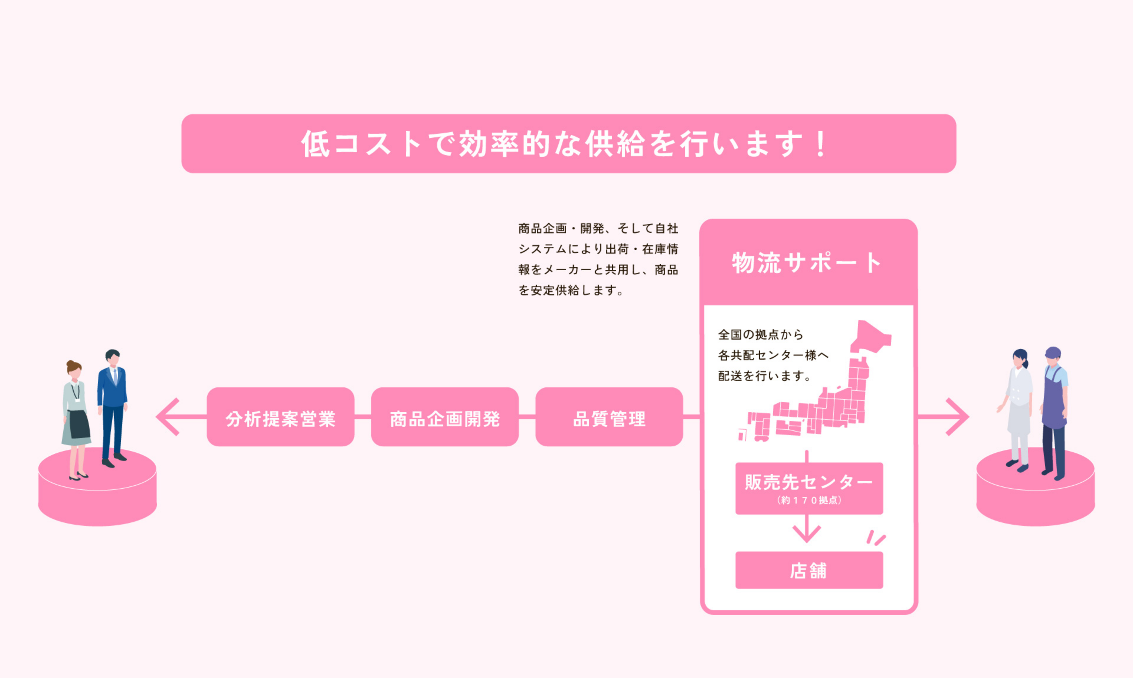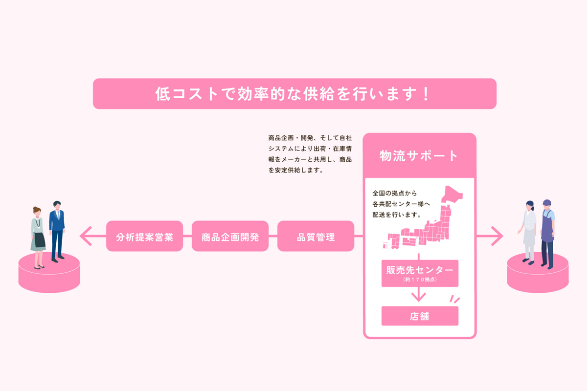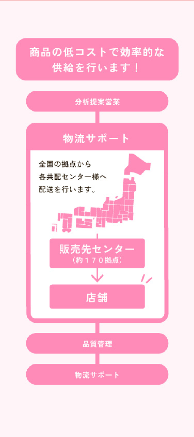 • 日本全国に温度帯変更加工を主体とした提携物流拠点があり、製造と物流計画が立てやすく、低コストで効率的な供給が可能です。