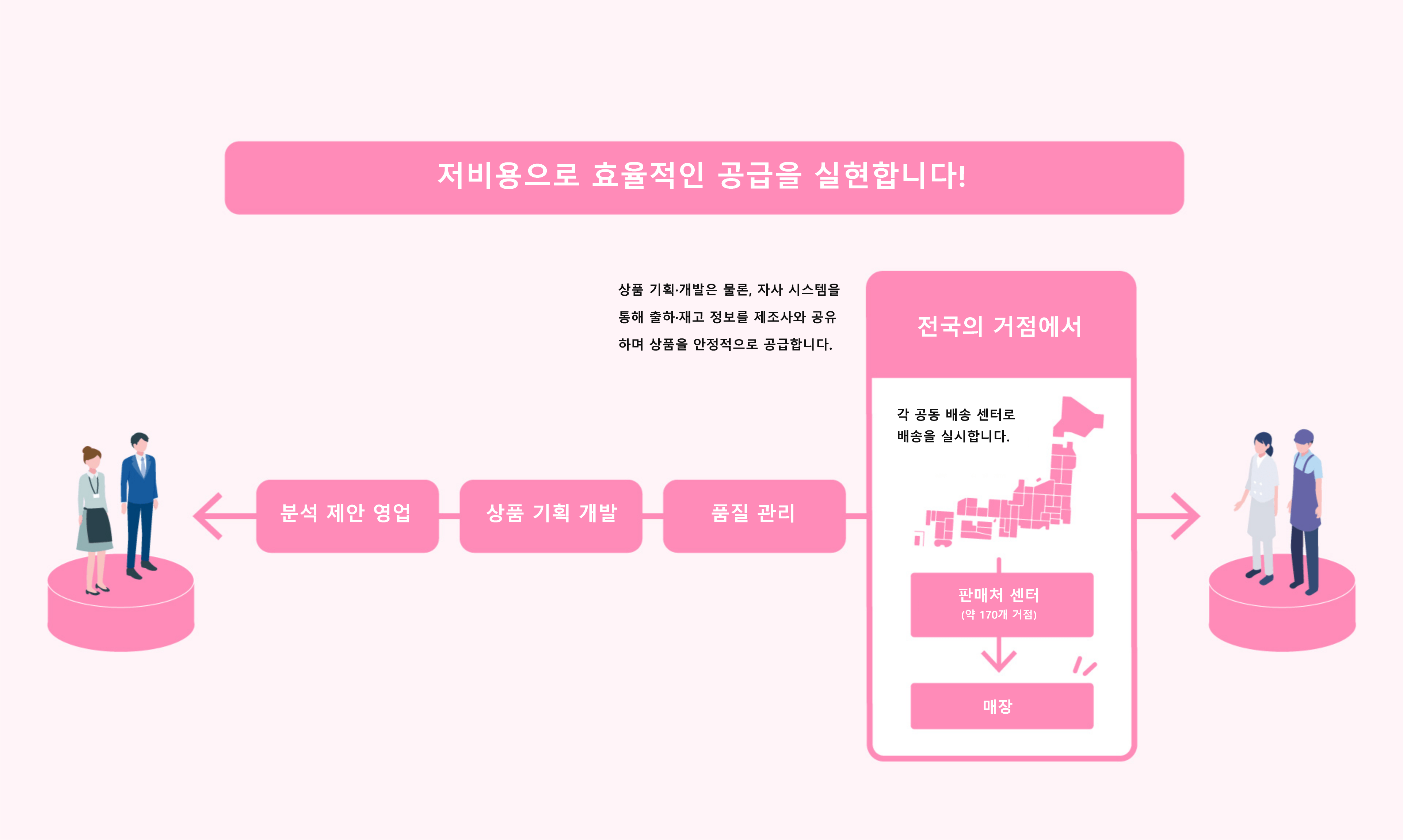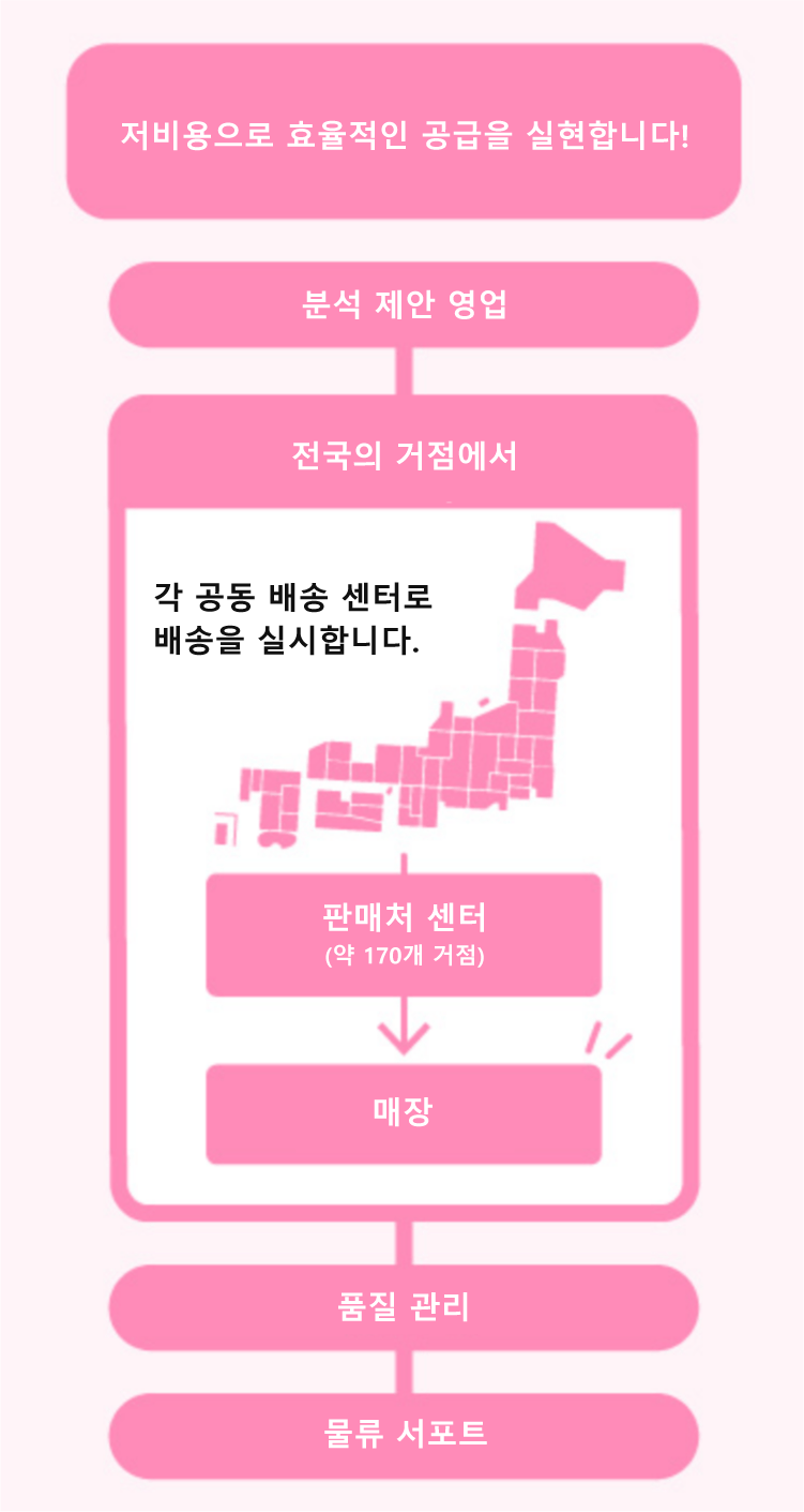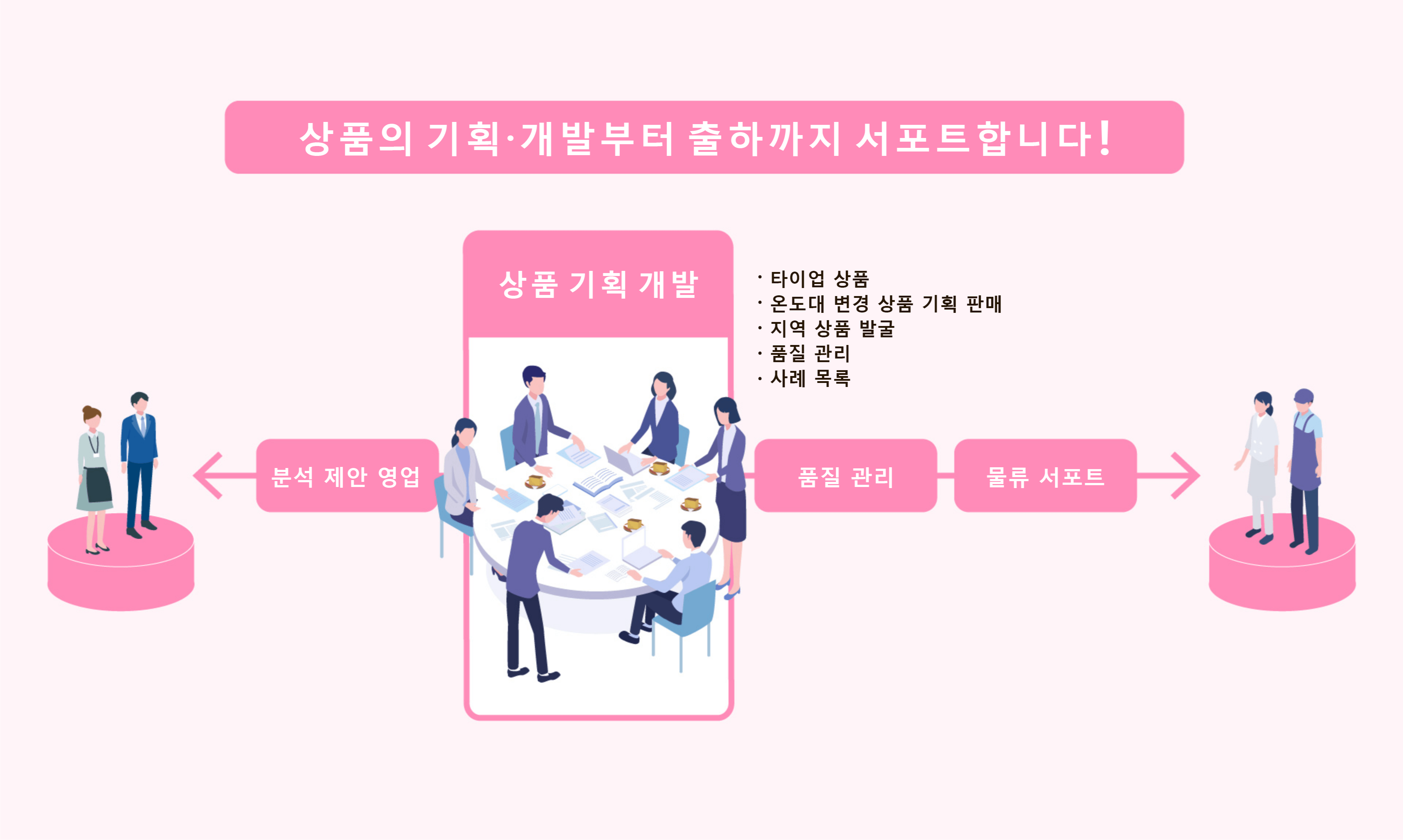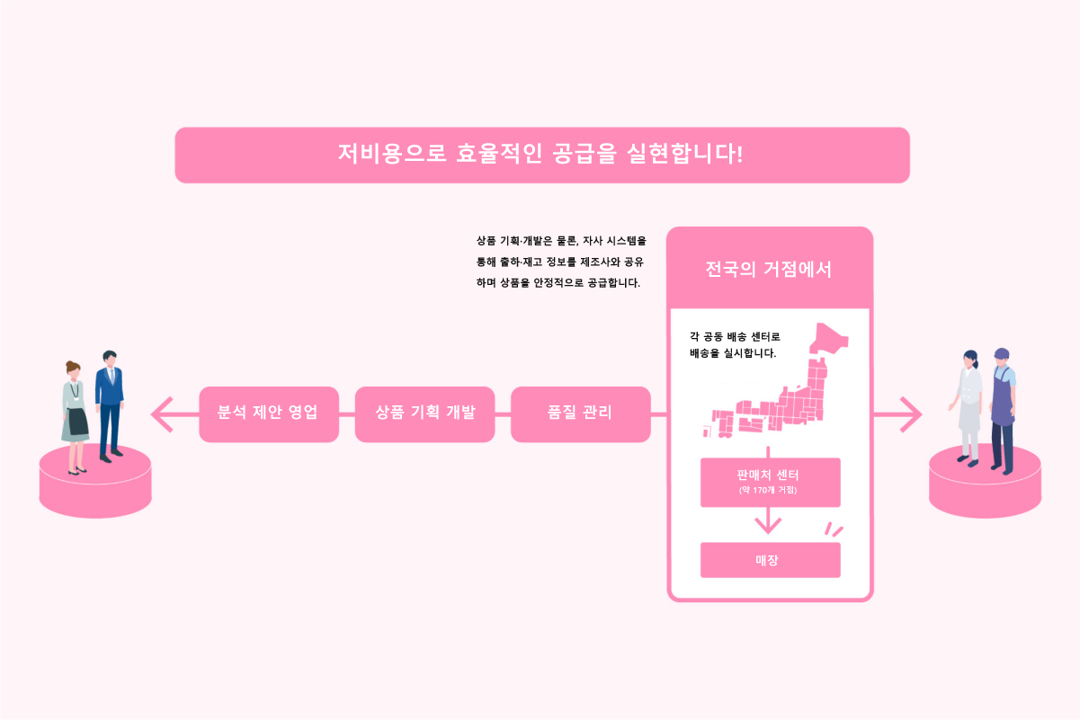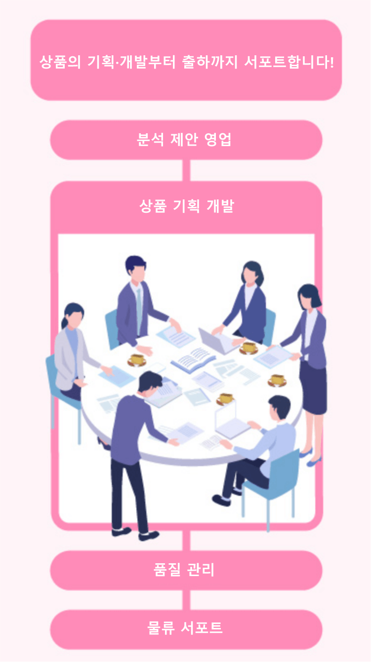다양한 상품의 기획 개발 및 제안은 물론, 품질 관리부터 물류 코디네이트까지 토탈 서포트합니다.